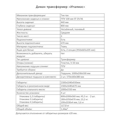 Диван-трансформер Италмас (Аквилон) продается в интернет-магазине mebel-online-nizhnij-tagil.ru по цене 73 376 руб. Есть доставка по Нижнему Тагилу и Свердловской области. Возможность подъема на этаж и сборки уточняйте у менеджера по телефону 8(800)505-27-11.
